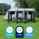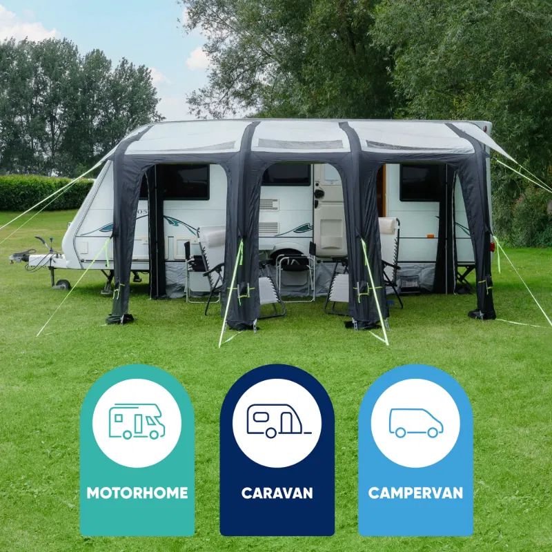 The Leisurewize Skyliner is a spacious and luxurious air awning. It provides you with ample space for tables and chairs and for getting friends and family together. Plus, this awning gives you plenty of room for storage and it can also act as an additional sleeping area at night.