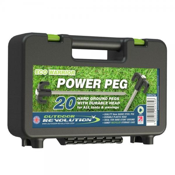 Providing a secure hold for tents and awnings, these Eco Warrior Power Pegs from Outdoor Revolution come in a handy carry case of x20 pegs.