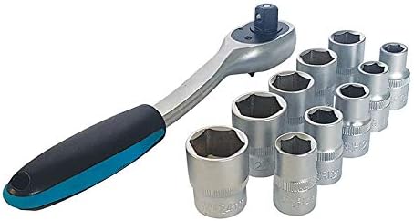 A chrome vanadium steel 1/2” ratchet driver socket set that comes with 10 different-sized sockets.