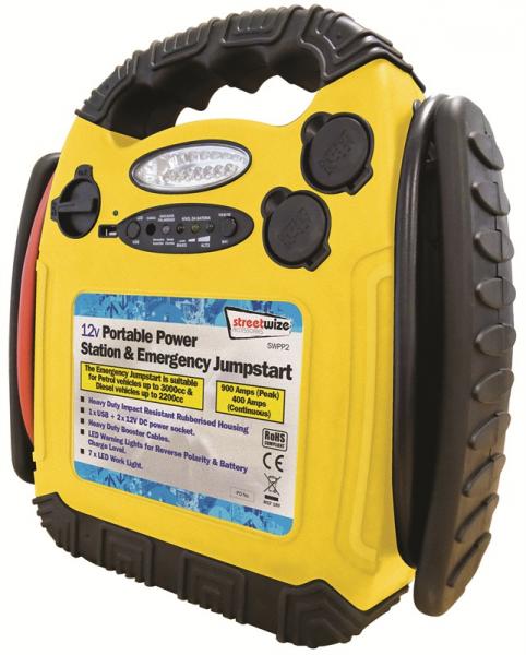 A portable 12V power station that can emergency jump start petrol vehicles up to 3000cc and diesel vehicles up to 2200cc.