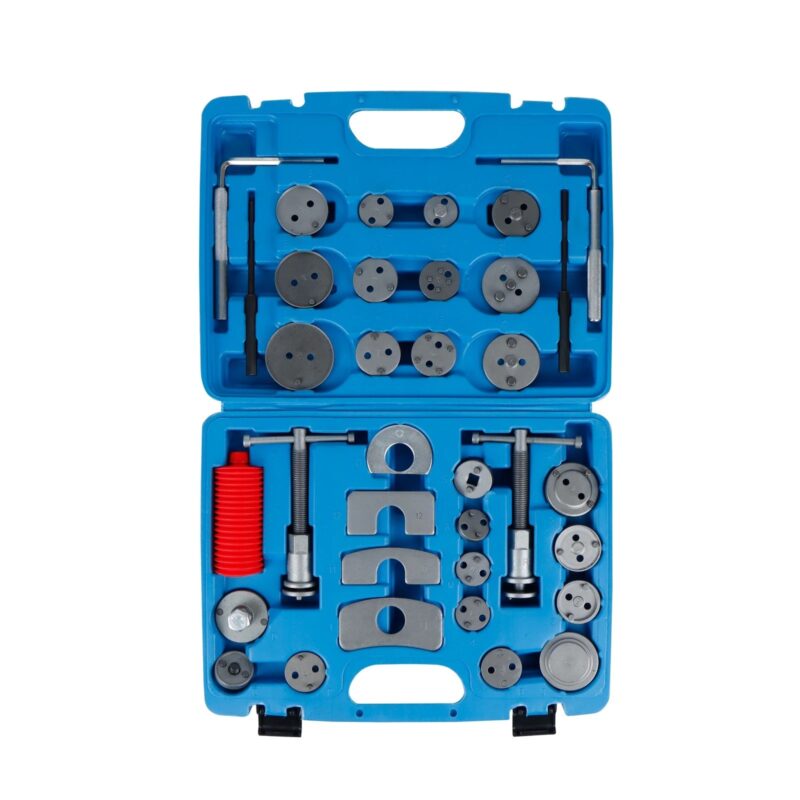 A comprehensive 35-piece kit designed to help reposition brake calipers and pistons when replacing worn brake pads, discs, or shoes. This wind-back set makes the process quicker, safer, and more efficient by preventing damage to the piston or seals.