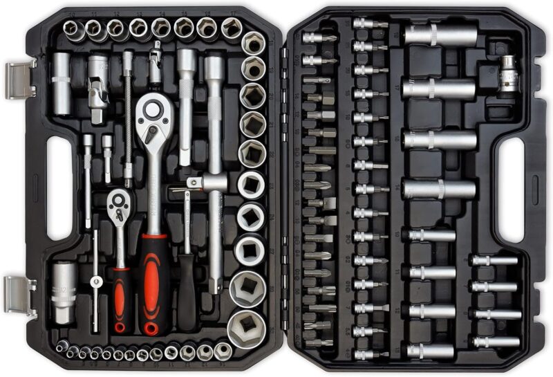 This comprehensive 94-piece socket and bit set from Streetwize is suitable for professionals, DIY enthusiasts and domestic use. The set includes both ¼” & ½” socket wretches, extension bars, a 3-way holder, a 72-teeth ratchet handle, and a universal holder along with a wide range of sockets and bits.