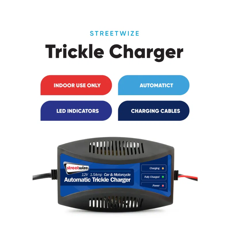 A mains operated 12V automatic trickle charger that provides a slow charge (1.5A) to help you keep your 12V batteries fully charged and optimised when not in use. This trickle charger is perfect for overnight charging as the slow charge prevents the battery from getting overcharged.