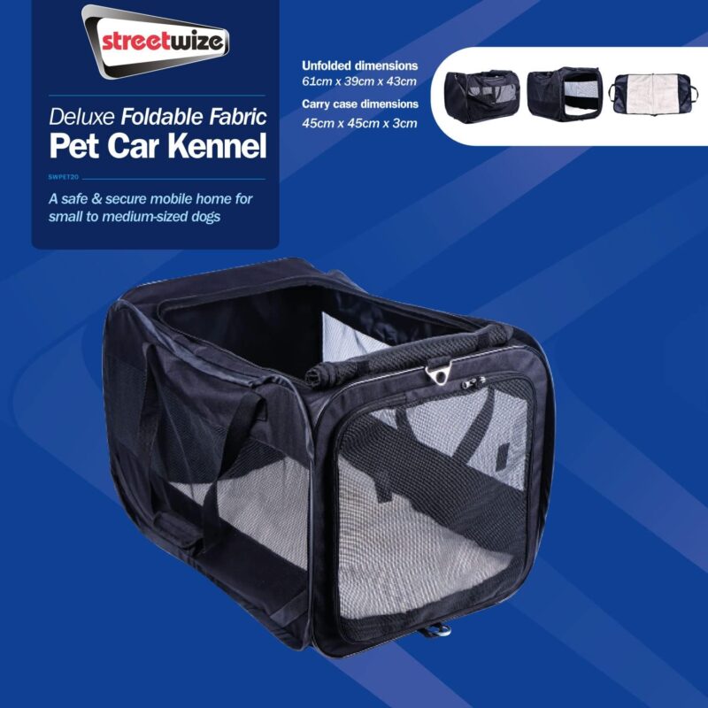 Streetwize Large Deluxe Foldable Fabric Pet Car Kennel – Black SWPET20. This foldable pet kennel from Streetwize provides a safe & secure mobile home for small to medium-sized dogs. The kennel provides privacy & protection against any elements during road trips.