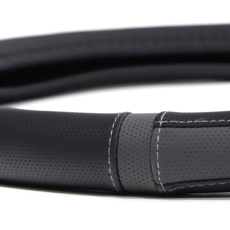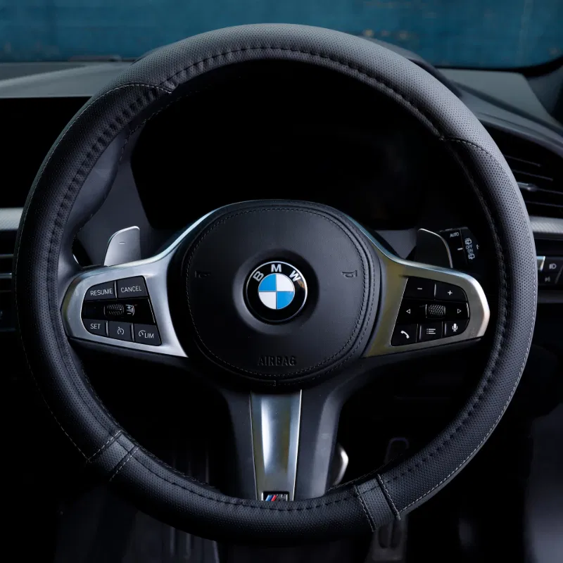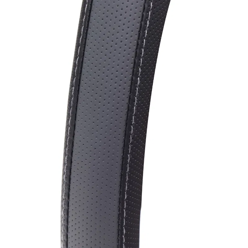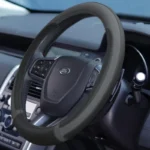 This steering wheel glove provides protection from wear and tear while enhancing the interior of the vehicle, thanks to its black and grey finish.